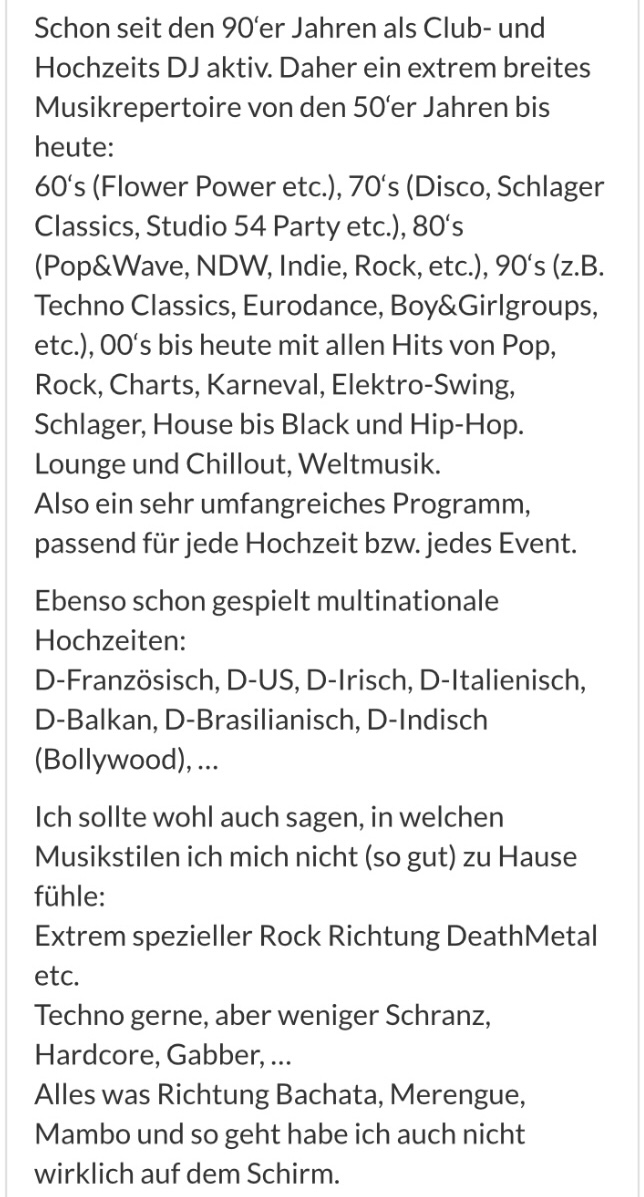 Als echter Musikliebhaber fühlt er sich in allen Genres zuhause – von den Klassikern der 70er bis 2000er über aktuelle Clubsounds bis hin zu Rock, House oder Schlager. Mit seinem Gespür für den perfekten Mix sorgt er auf jeder Veranstaltung für authentische, emotionale und unvergessliche Momente.
