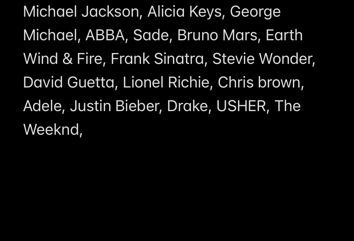 Pop, 80er, Rock, Tanzmusik, Partymusik (Top40), 90er, 2000er, Aktuelle Charts, Funk/Soul/RnB, Jazz & Swing, Loungemusik, Klassik, Hip Hop/Rap